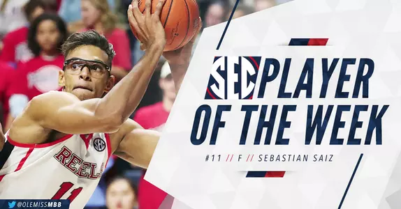 Saiz posted a double-double with 22 points and a career-high 19 rebounds in Ole Miss' thrilling comeback win over UMass last week. The Rebels ended the game on a 11-0 run capped by Saiz's game-winning put back with 3.3 seconds left to secure the win. He finished a single rebound shy of becoming the first Rebel since Walter Actwood in 1975 to post a 20-point, 20-rebound game. His 19 rebounds were the most by a Rebel since Murphy Holloway pulled down 20 in 2010 and is the most in the SEC this season. Saiz the SEC's active career leader in rebounding leads the league pulling down 10.0 boards a game.