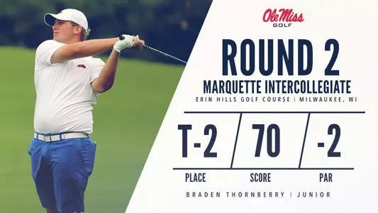 Junior Braden Thornberry led the Rebels for the second day in a row as he carded four birdies in the first 10 holes en route to shooting 2-under par (70). This score was one stroke under his score posted in the first round, placing him in a two-way tie for second place alongside Harry Ellis of Florida State. Austin Kendziorski of the host team, Marquette, currently holds the top spot after turning in a 67 for the opening round and even par (72) in Round 2.
