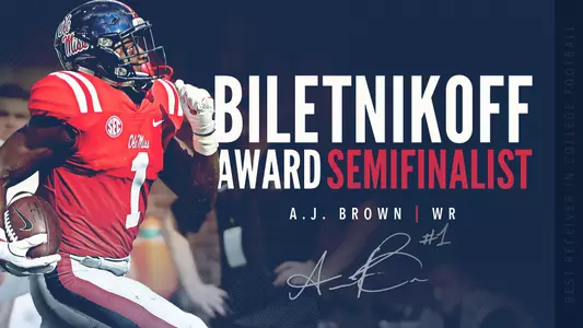 TALLAHASSEE, Fla. -- Ole Miss wide receiver A.J. Brown is one of 10 semifinalists for the 2017 Biletnikoff Award, the Tallahassee Quarterback Club (TQC) Foundation, Inc., announced Monday morning.