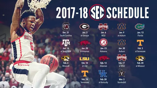 For the first time since the 2013-14 campaign, Ole Miss will not begin conference action against Kentucky. However, the Rebels will still face a premier opponent at home as 2017 Final Four participant South Carolina makes the trip to Oxford on New Year's Eve (Dec. 31). Ole Miss will follow the SEC opener by kicking off the 2018 calendar year on the road, traveling to Georgia (Jan. 3).