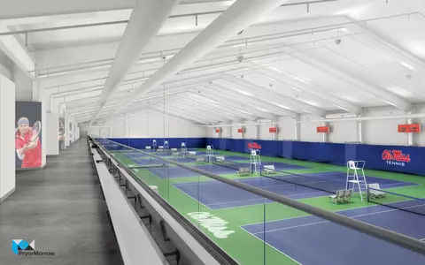 A $300,000 gift from Louis and Lucia Brandt of Houston, Texas, helped jump-start construction on the 52,000-square-foot, two-story building. Located southeast of the Olivia and Archie Manning Athletic Performance Center on Manning Way, the facility will feature six indoor tennis courts for practice and competition, grandstand bleacher seating for 300 spectators, fan amenities and a spacious lobby.