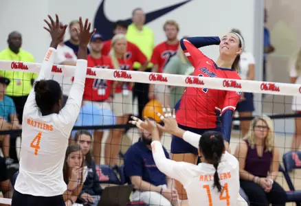 JONESBORO, Ark. -- The Ole Miss volleyball team split a pair of matches on day one of the A-State Invitational hosted by Arkansas State at the Convocation Center Friday. The Rebels won 3-2 in the morning against Virginia Tech and then suffered a 3-1 loss to SMU in the afternoon match.