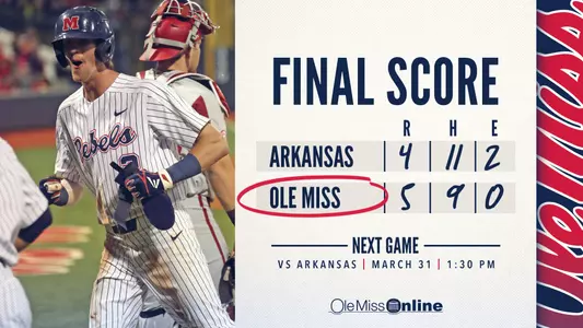 OXFORD, Miss. -- It came down to the wire, but the No. 4 Ole Miss baseball team (24-4, 5-3 SEC) was able to fend off the No. 5 Arkansas Razorbacks (19-8, 5-3 SEC) in a 5-4 win to even the series on Friday night.