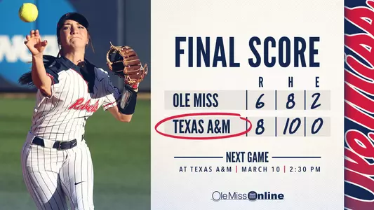 COLLEGE STATION, Texas - No. 18 Ole Miss (13-5, 0-1 SEC) scored five runs in the final two innings of Friday's SEC opener at No. 7 Texas A&M (22-3, 1-0 SEC) but couldn't complete the comeback, falling 8-6 at the Aggie Softball Complex.
