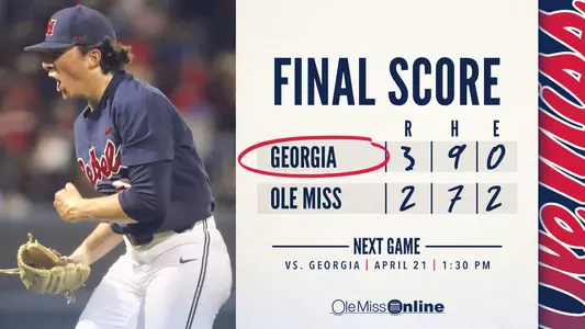 OXFORD, Miss. -- Georgia plated a run in the eighth and ninth to outlast Ole Miss in a Friday night's pitchers' duel to take Game 1 of the series, 3-2.