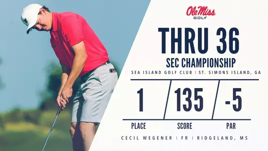 ST. SIMONS ISLAND, Ga. - After pacing the No. 34 Ole Miss men's golf team in round one of the SEC Championship, freshman Cecil Wegener continued his strong play to become the tournament's overall leader heading into the final round. Posting a career-low 65 (-5) on the par-70 Seaside Course at Sea Island Golf Club, Wegener moved to 5-under through 36 holes to hold a one-shot lead over four other golfers.