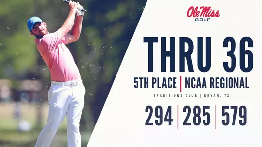 Ole Miss will wrap up the NCAA Bryan Regional tomorrow, looking to lock up a spot to the NCAA Championships. Just like the previous two rounds, the Rebels will tee off No. 10 Wednesday morning (May 16) beginning at 8 a.m. CT. Ole Miss will be paired with fourth-place UCLA and sixth-place South Carolina.