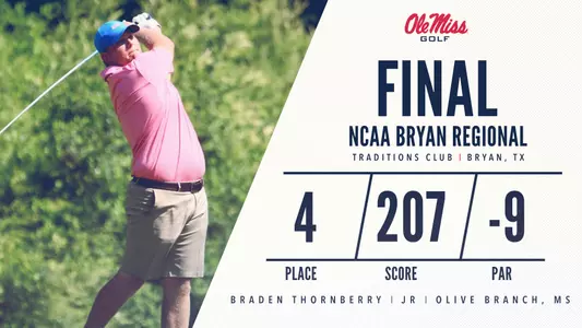 BRYAN, Texas - On the final day of the NCAA Bryan Regional at Traditions Club, Ole Miss men's golfer Braden Thornberry fired a final round 70 (-2) to secure his bid to the 2018 NCAA National Championships. Thornberry, the defending national champion, posted a three-day total of 207 (-9) to earn a spot as the top individual not on a qualifying team.