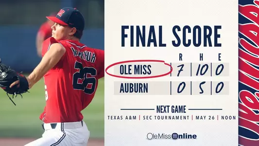 HOOVER, Ala. - The No. 4 Ole Miss baseball team dominated No. 21 Auburn, 7-0, Friday afternoon to advance to the semifinals of the SEC Tournament for the second time in three years.